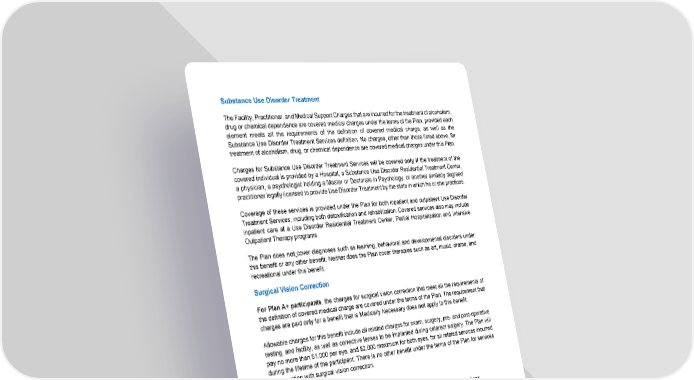 68 Substance Use Disorder Treatment The Facility, Practitioner, and Medical Support Charges that are incurred for the treatment of alcoholism, drug or chemical dependence are covered medical charges under the terms of the Plan, provided each element meets all the requirements of the definition of covered medical charge, as well as the Substance Use Disorder Treatment Services definition. No charges, other than those listed above, for treatment of alcoholism, drug, or chemical dependence are covered medical charges under this Plan. Charges for Substance Use Disorder Treatment Services will be covered only if the treatment of the covered individual is provided by a Hospital, a Substance Use Disorder Residential Treatment Center, a physician, a psychologist holding a Master or Doctorate in Psychology, or another similarly degreed practitioner legally licensed to provide Use Disorder Treatment by the state in which he or she practices. Coverage of these services is provided under the Plan for both inpatient and outpatient Use Disorder Treatment Services, including both detoxification and rehabilitation. Covered services also may include inpatient care at a Use Disorder Residential Treatment Center, Partial Hospitalization and Intensive Outpatient Therapy programs. The Plan does not cover diagnoses such as learning, behavioral and developmental disorders under this benefit or any other benefit. Neither does the Plan cover therapies such as art, music, drama, and recreational under this benefit. Surgical Vision Correction For Plan A+ participants , the charges for surgical vision correction that meet all the requirements of the definition of covered medical charge are covered under the terms of the Plan. The requirement that charges are paid only for a benefit that is Medically Necessary does not apply to this benefit. Allowable charges for this benefit include all related charges for exam, surgery, pre- and post-operative testing, and facility, as well as corrective lenses to be implanted during cataract surgery. The Plan will pay no more than $1,000 per eye, and $2,000 maximum for both eyes, for all related services incurred during the lifetime of the participant. There is no other benefit under the terms of the Plan for services in connection with surgical vision correction. Telehealth Telehealth is the delivery of health-related services and information via telecommunications technologies, including telephones, smartphones and personal computers, for virtual consultations. CareFirst Administrators Telehealth Connection is a telemedicine program providing access to certain telehealth services as part of your medical plan through CareFirst Administrators. It includes live appointments with board- certified doctors, via secure video or phone, who may diagnose and prescribe, when appropriate. Telehealth is not intended to replace your Primary Care Physician (PCP). Telehealth is designed to handle minor, non-emergency medical issues for eligible employees and their covered dependents enrolled in a medical plan through CareFirst Administrators. This program is accessible, 365 days a year, from most locations in the United States with an internet connection, or a US-based phone number that can receive a call back.